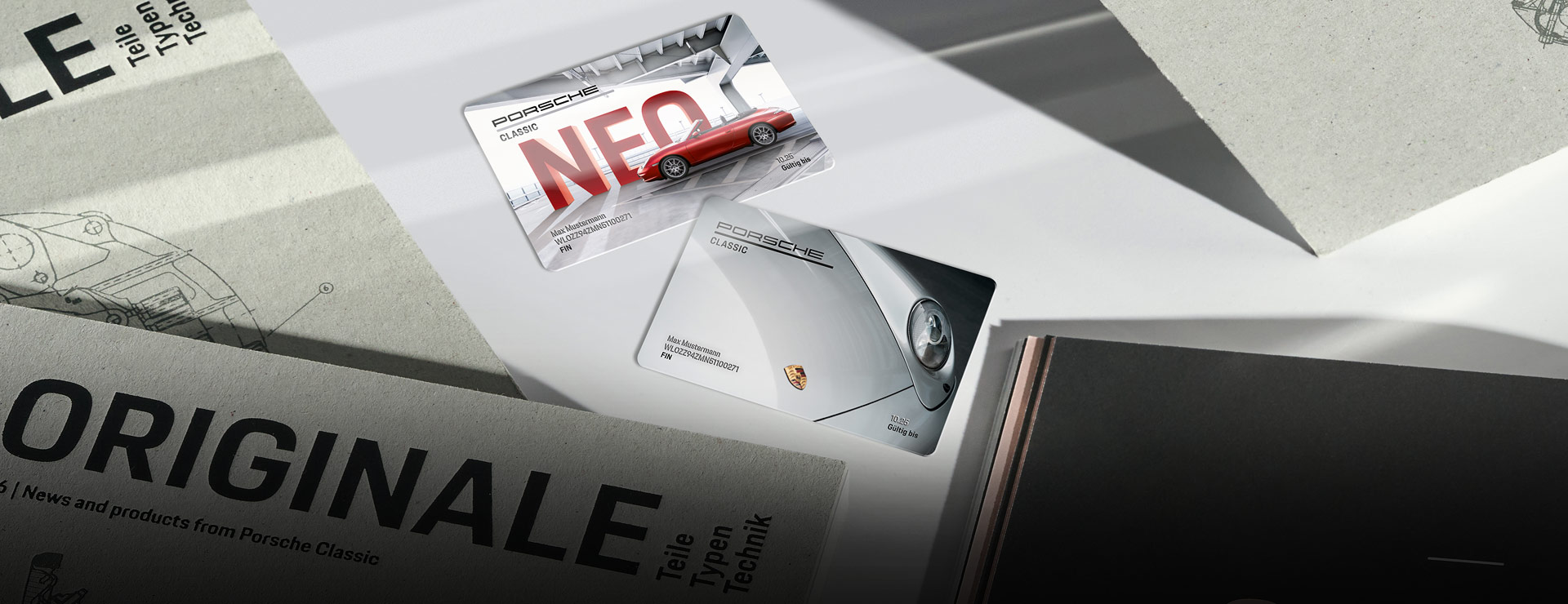 Für unsere zeitlosen und traditionellen Klassiker bieten wir Ihnen die Porsche Classic Card Heritage und für die Klassiker von morgen die Porsche Classic Card NEO.1 Beide Kartenvarianten bieten Ihnen neben einer Mobilitätsgarantie den Zugang zu exklusiven Vorteilen, Card Specials und Services. Die Angebote des Classic Card Programms können Sie nur bei teilnehmenden Porsche Partnern in Anspruch nehmen.