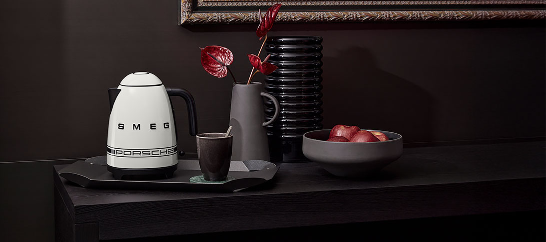 Das ikonische 50er-Jahre-Design von Smeg trifft auf die puristische Formensprache von Porsche: matte schwarze Akzente an Griff, Sockel und Ausguss sowie der charakteristische Porsche-Streifen auf dem Gehäuse. Mit einem Fassungsvermögen von 1,7 Litern ist der Wasserkocher ideal für jede Gelegenheit – vom Frühstück bis zum Nachmittagstee. Der Deckellässt sich sanft öffnen und ein herausnehmbarer Kalkfilter aus Edelstahl sorgt für sauberes Wasser. Mit automatischer Abschaltung bei 100 °C und einem 360°-Sockel erfüllt das Gerät alle Ansprüche – funktional, vielseitig, stilvoll.