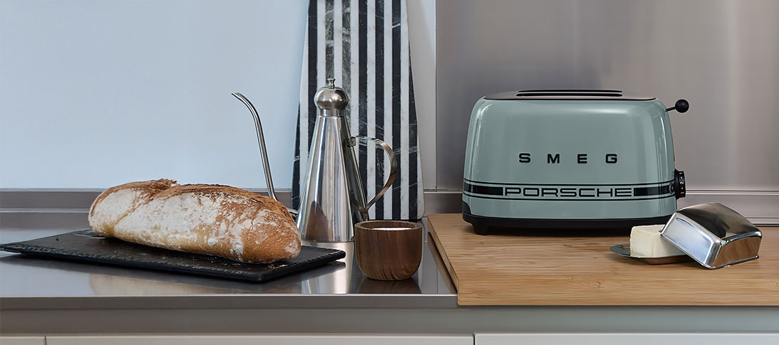 Das ikonische 50er-Jahre-Design von Smeg trifft auf die puristische Designsprache von Porsche: Mattschwarze Akzente und der charakteristische Porsche-Streifen am Gehäuse bringen sportliche Eleganz in die Küche.